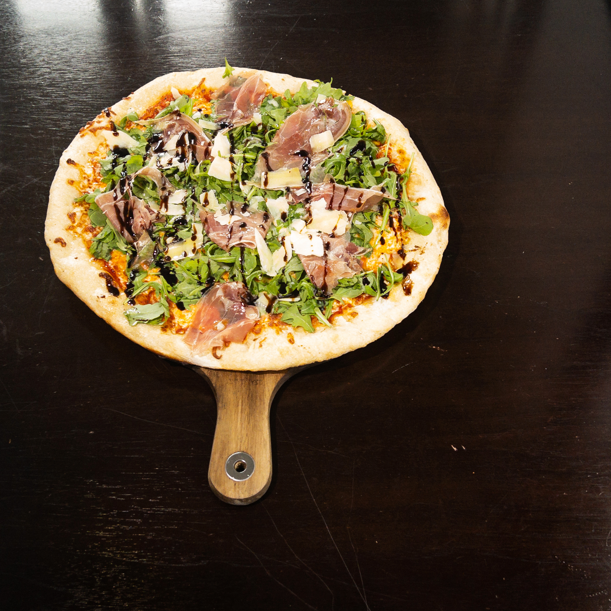 Classico tomato sauce, mozzarella, prosciutto, baby arugula, shaved parm, balsamic glaze, evo